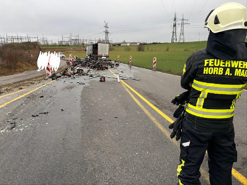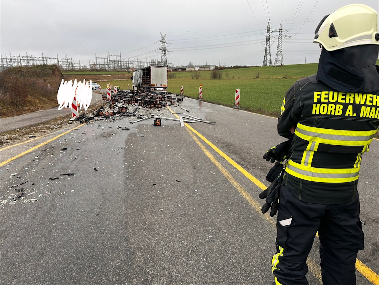 In einer Kurve der neuen Behelfsumfahrung an der Baustelle B289 verlor der Fahrer eines Sattelzuges Teile seiner Ladung. Dabei verteilten sich zahlreiche Getränkekisten über beide Fahrspuren.