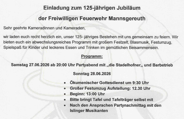 ...Am Freitag, 23. Januar 2026, findet um 19:00 Uhr im Feuerwehrhaus die Jahreshauptversammlung statt.